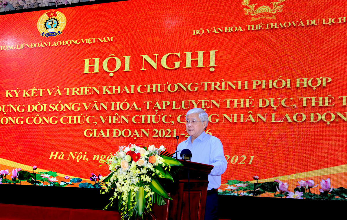 Phát biểu khai mạc, ông Nguyễn Đình Khang - Chủ tịch Tổng LĐLĐ Việt Nam nhấn mạnh, với nhận thức xây dựng đời sống văn hóa trong công chức, viên chức, công nhân lao động (CCVCCNLĐ) là một bộ phận quan trọng trong xây dựng và phát triển văn hóa, con người Việt Nam, Tổng LĐLĐ Việt Nam và Bộ VHTTDL đã xây dựng và triển khai thực hiện Chương trình phối hợp nhằm nâng cao hiệu quả hoạt động xây dựng đời sống văn hóa trong CCVCCNLĐ, xây dựng cơ quan, đơn vị, doanh nghiệp văn hóa.