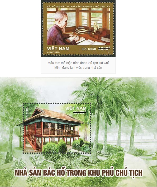 Bộ tem bưu chính "Nhà sàn Bác Hồ trong Khu Phủ Chủ tịch" gồm 1 mẫu tem và 1 block với giá mặt 4000 đồng và 15000 đồng, khuôn khổ tem 43 x 32 (mm), khuôn khổ block 100 x 70 (mm) do họa sỹ Lê Khánh Vương (Tổng công ty Bưu điện Việt Nam) thiết kế, được cung ứng trên mạng lưới bưu chính từ ngày 17/5/2023 đến ngày 31/12/2024. Với phong cách thiết kế đồ họa, cô đọng, mẫu tem thể hiện hình ảnh Chủ tịch Hồ Chí Minh đang làm việc trong nhà sàn, mẫu blog giới thiệu ngôi nhà sàn và khái quát khung cảnh vườn cây, ao cá quanh nhà sàn.
