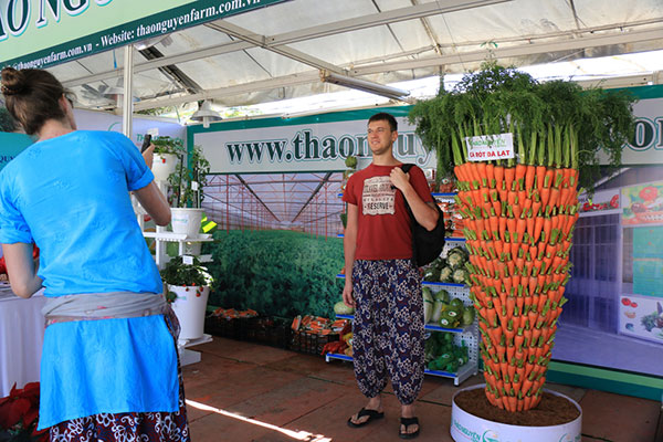 Nhiều du khách thích thú chụp hình với củ cà rốt khổng lồ được kết bằng 100kg cà rốt tươi của Công ty Thảo Nguyên, tham quan mô hình sản xuất rau bằng phương pháp thủy canh của Công ty An Phú…