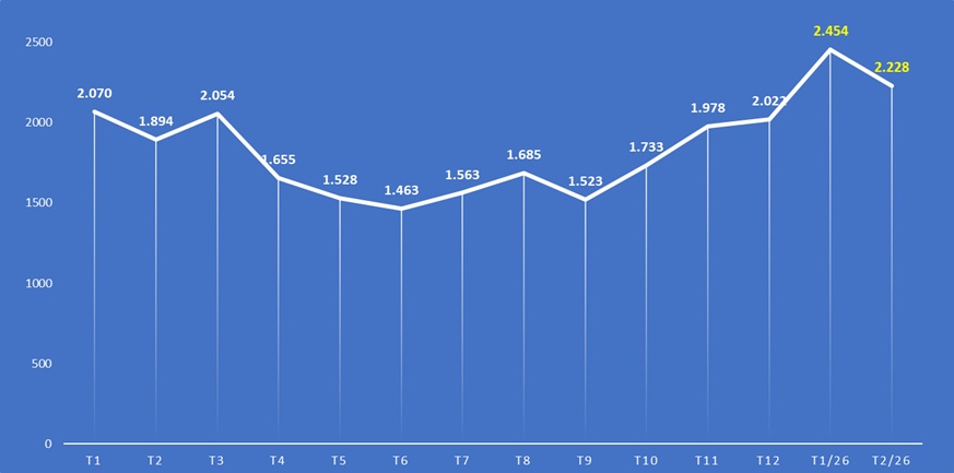 Biểu đồ 1. Khách quốc tế đến Việt Nam theo tháng năm 2025 và 2 tháng đầu năm 2026 (nghìn lượt)