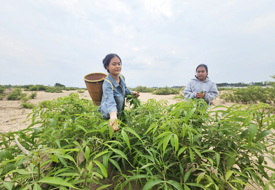 Những cô gái Jrai hái đọt lá cây dơnia ở khu vực ven sông Ba. Ảnh: R.H