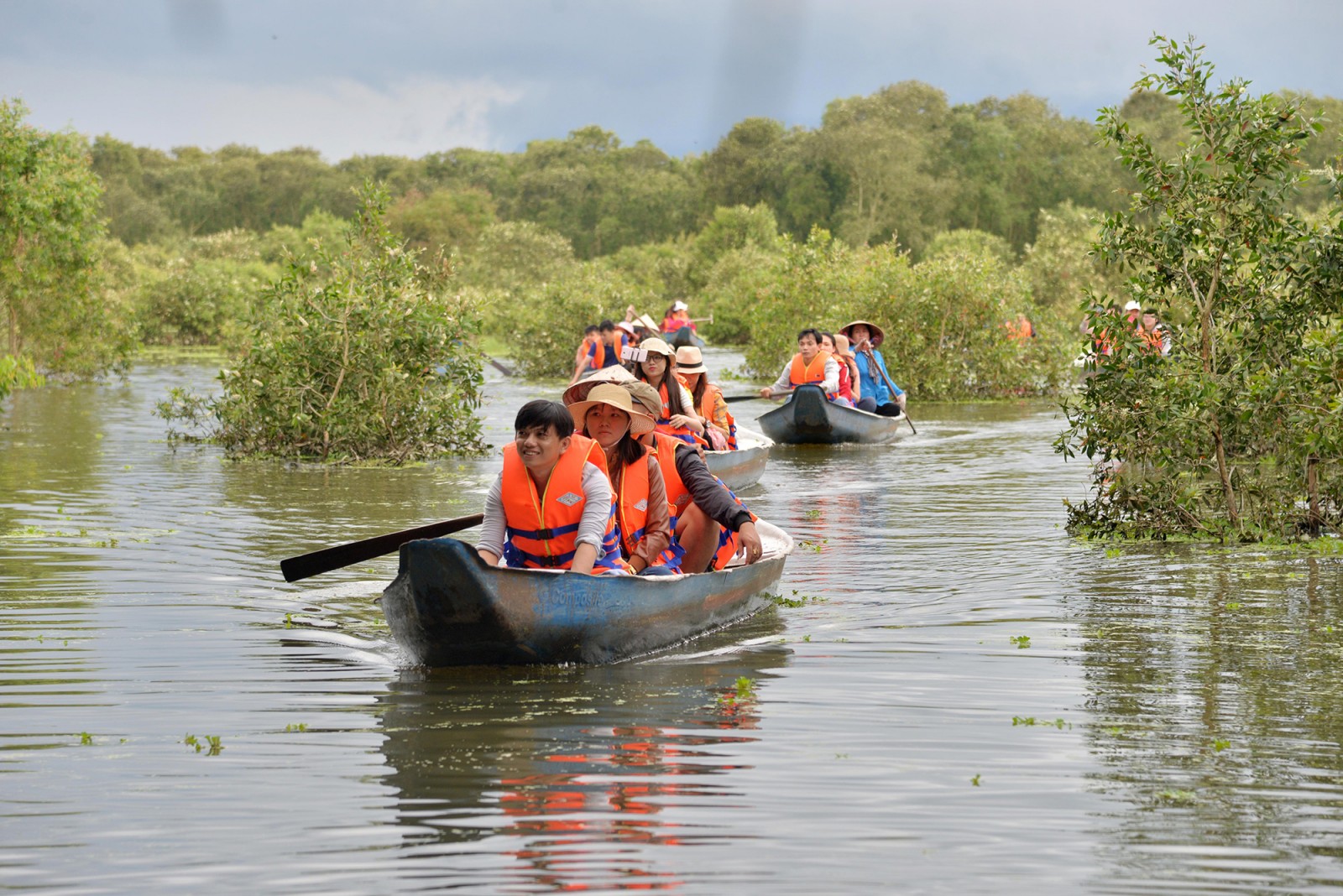 Du khách tham quan rừng tràm Trà Sư.