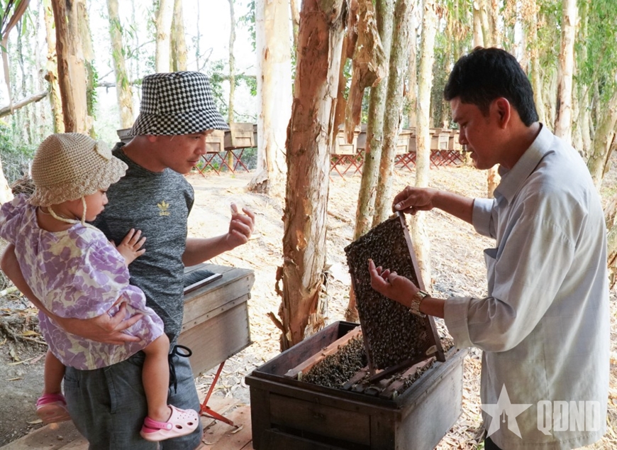 Du khách tham quan mô hình nuôi ong lấy mật gắn với bảo tồn hệ sinh thái rừng ngập nước và sinh kế của người dân địa phương.