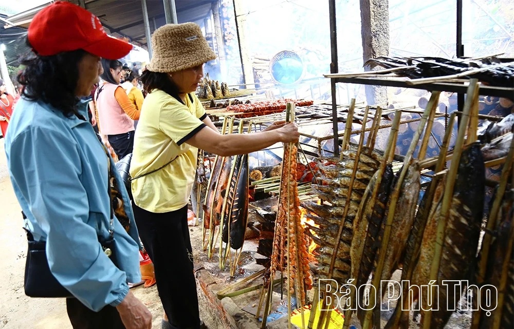 Đặt chân lên bến đền, du khách nhanh chóng hòa vào dòng người thành kính dâng hương, cầu mong một năm mới bình an, sức khỏe và may mắn. Sau hành trình làm lễ các đền chính, du khách khó lòng bỏ qua mùi thơm nức của cá nướng tỏa ra từ những bếp than đỏ rực bên bến thuyền. Sống trong môi trường tự nhiên của sông Đà, ăn phù du và các sinh vật trôi theo dòng nước, các loài cá nơi đây từ lâu đã nổi tiếng bởi thịt chắc, thơm, ngọt và ít mỡ. Cá thiểu, cá măng, cá lăng, cá nheo, tôm sông... đều là những cái tên quen thuộc, được du khách “săn lùng” mỗi khi ghé thăm lòng hồ. Với đồng bào Mường sinh sống ven hồ, cá không chỉ là nguồn thực phẩm hằng ngày mà còn là nét văn hóa ẩm thực được gìn giữ qua nhiều thế hệ.