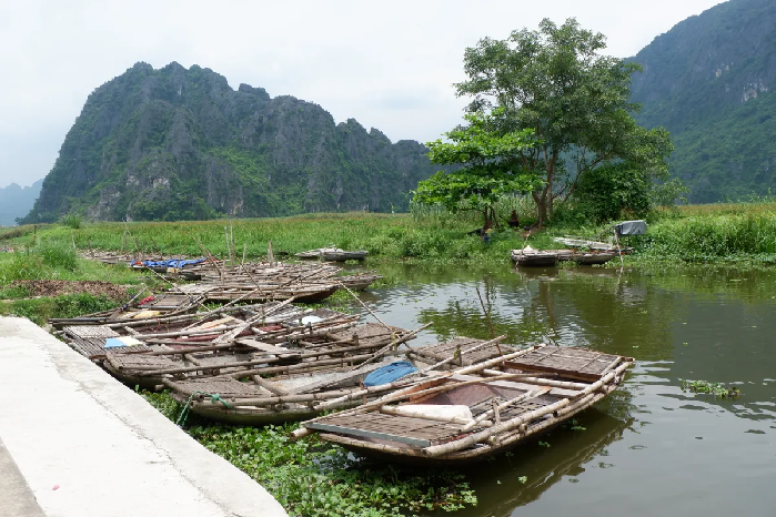 Bến thuyền Vân Long nằm đối diện Ban Quản lý Khu bảo tồn và Hợp tác xã du lịch sinh thái, không hàng quán chen chúc, chỉ có vài hàng nước nhỏ và những con thuyền nan xếp hàng ngay ngắn chờ khách.