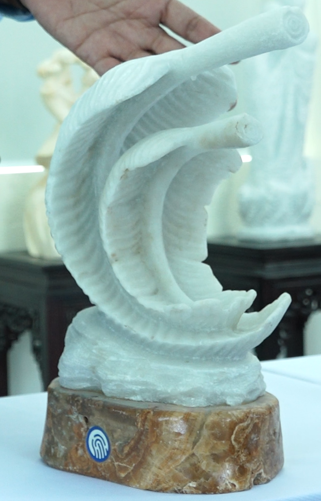 Sản phẩm độc bản của nghệ nhân Làng đá mỹ nghệ Non Nước được dán nhãn blockchain thông tin về sản phẩm. Ảnh: Hoàng Hiệp