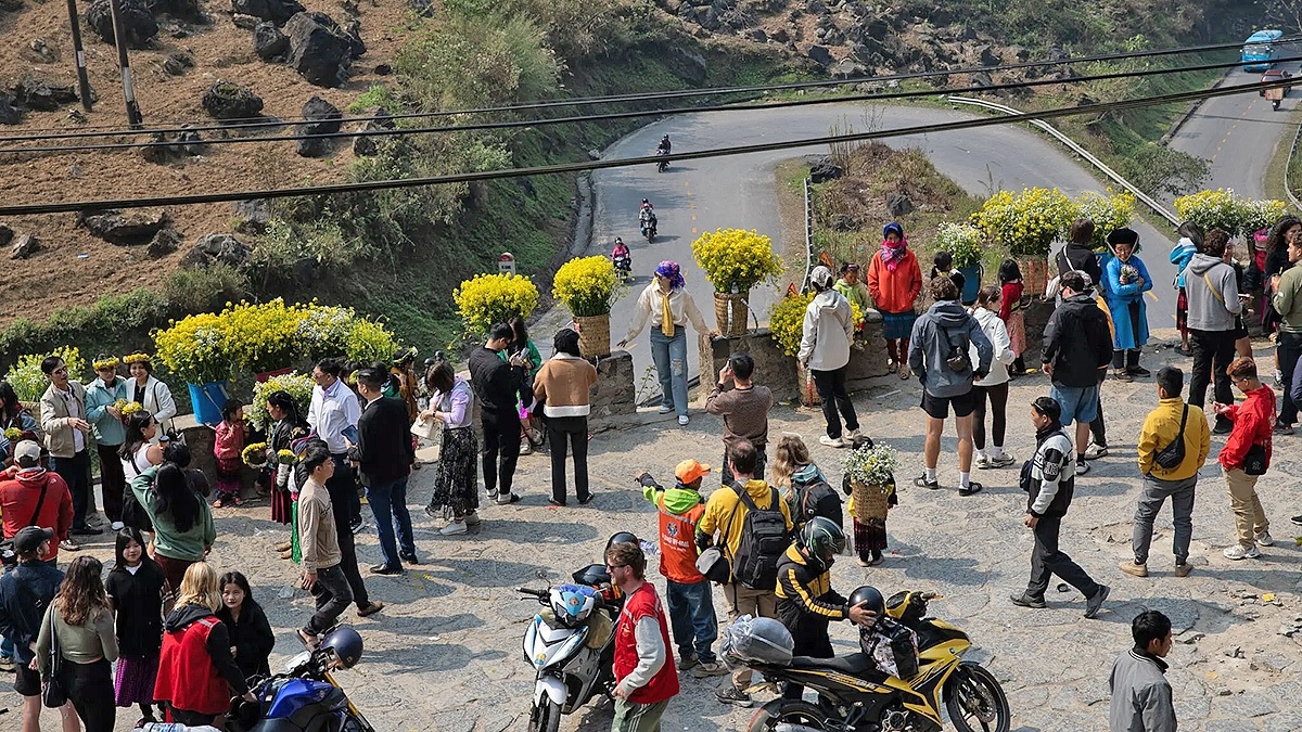 Khung cảnh dốc Thẩm Mã nhộn nhịp với những du khách đi xe máy chụp ảnh với những người địa phương bán đồ ăn và quà lưu niệm.
