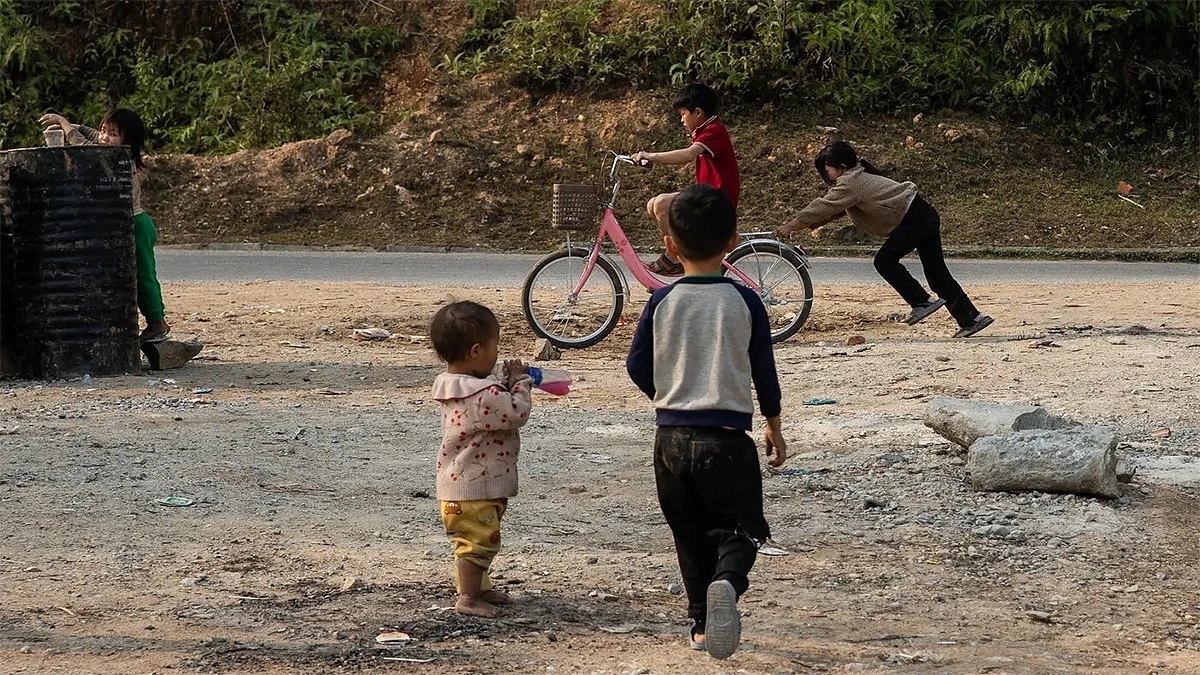 Trẻ em chơi đùa tại một điểm dừng chân ven đường dọc theo tuyến đường.
