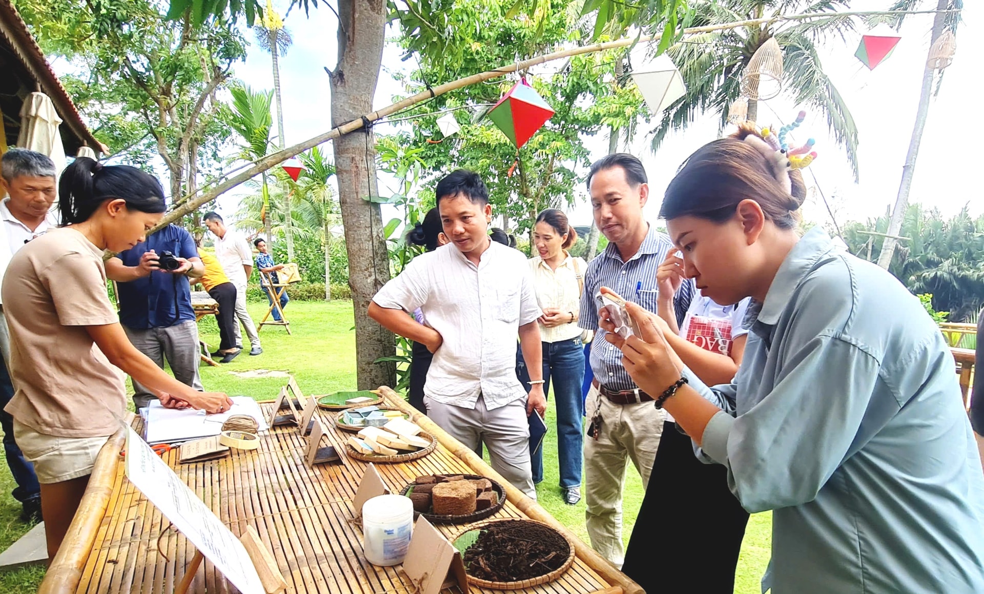 Du khách, doanh nghiệp tìm hiểu về "xà phòng xanh" và các sản phẩm được tái chế từ rác thải được trưng bày tại Hội An. Ảnh: Hoàng Liên
