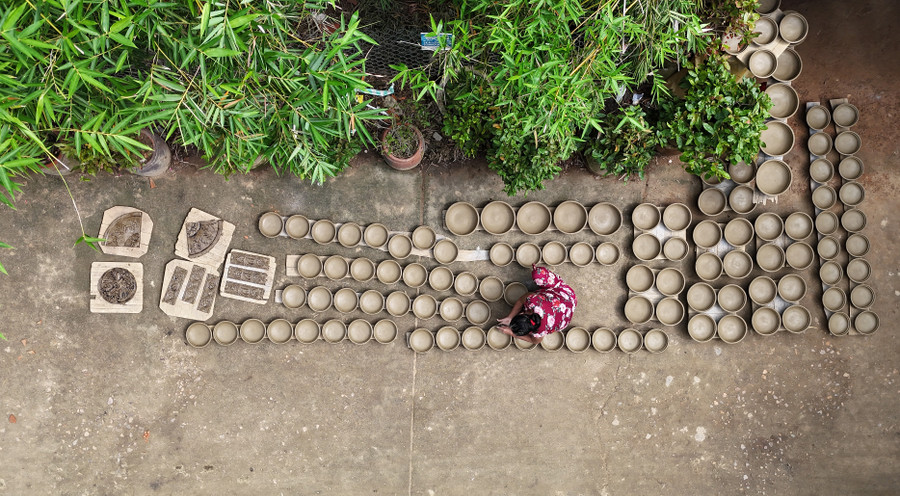 Người dân phơi gốm dưới những tán tre làng. Ảnh: Việt Hùng