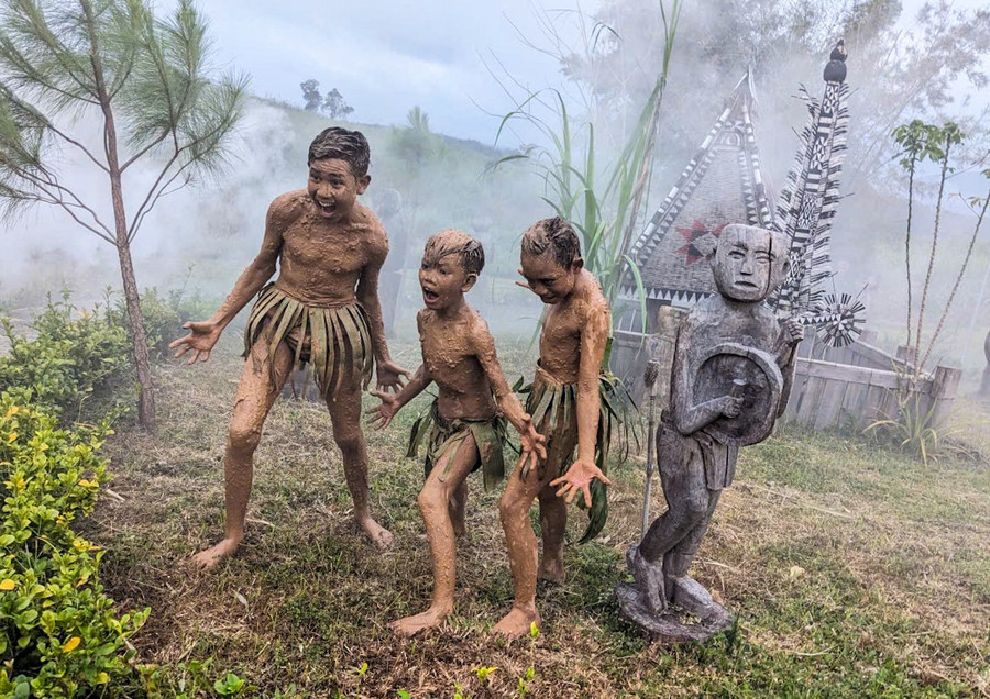 Các em bé ở Làng du lịch cộng đồng Mơ Hra - Đáp hóa trang "ma bùn" phục vụ đoàn nhiếp ảnh gia đến từ Ấn Độ. Ảnh: NVCC