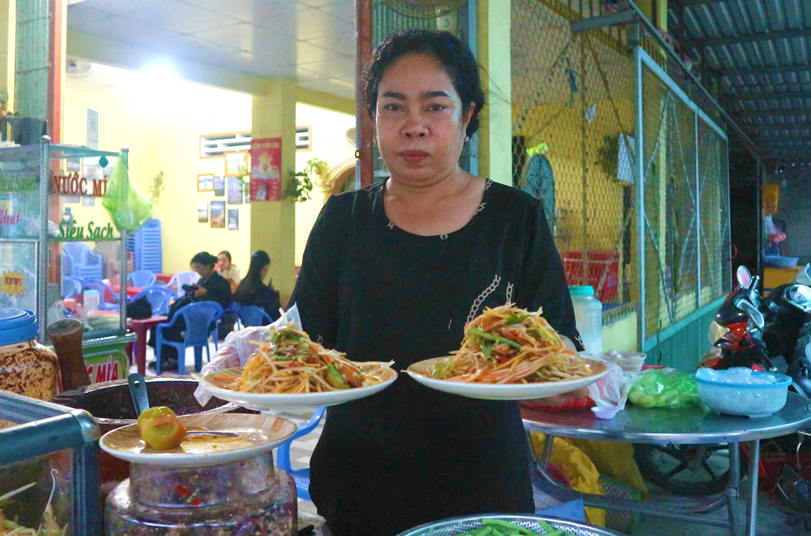 Món gỏi đu đủ đâm hấp dẫn được nhiều hộ kinh doanh trên đường ấp Phnom Pi.