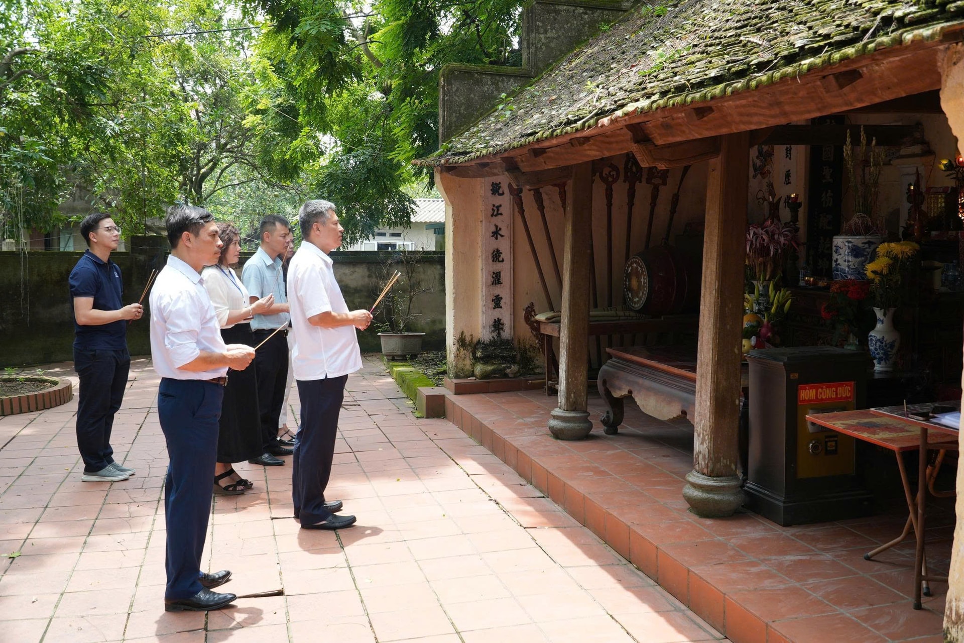 Lãnh đạo xã Chuyên Mỹ dâng hương tại đền thờ tổ nghề Khảm trai Trương Công Thành. Ảnh: Đình Lộc