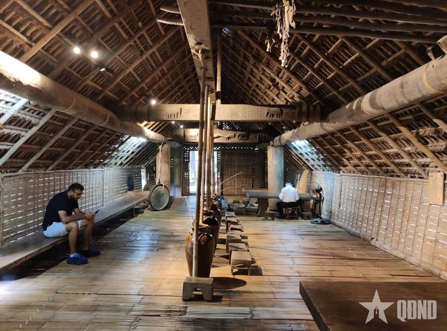 Không gian bên trong nhà dài tái hiện sinh hoạt truyền thống của đồng bào Tây Nguyên.