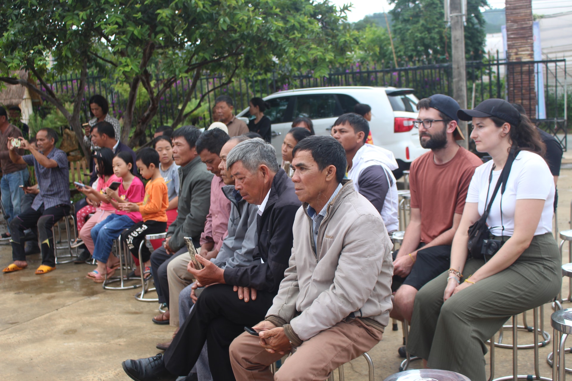 Du khách xem biểu diễn cồng chiêng ở Làng K’ho Cil lúc chiều muộn