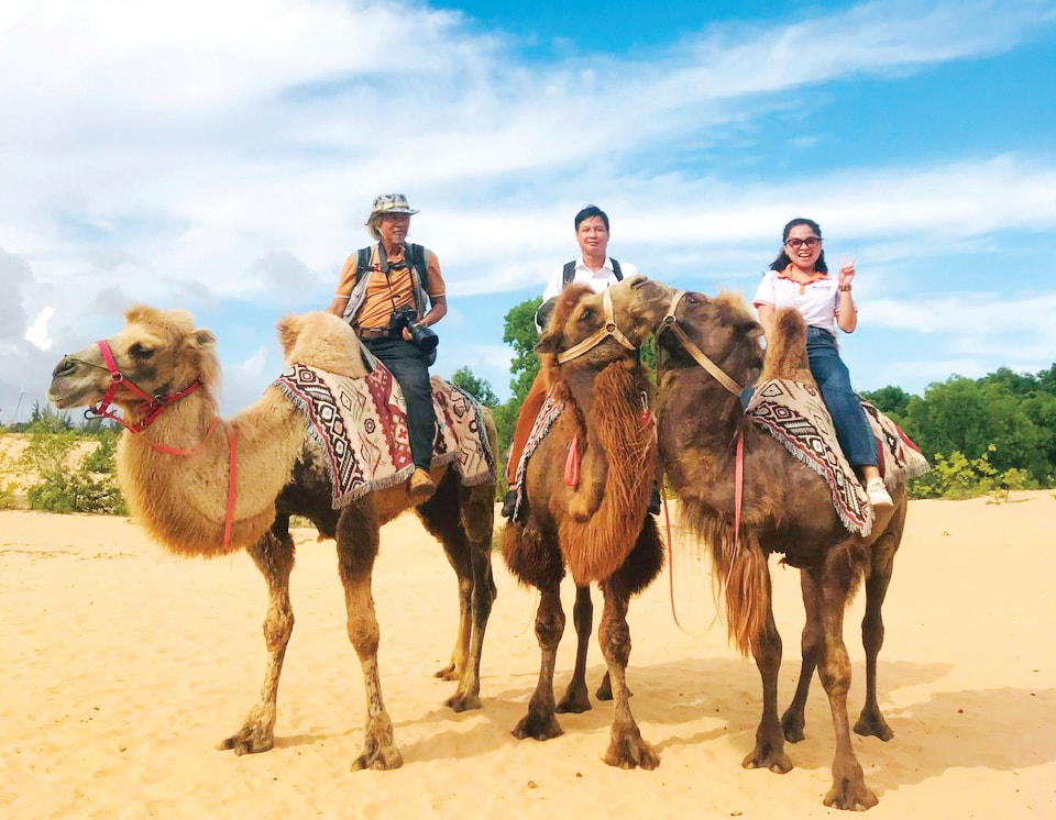 Du khách trải nghiệm dịch vụ cưỡi lạc đà trên đồi cát tại Bàu Trắng