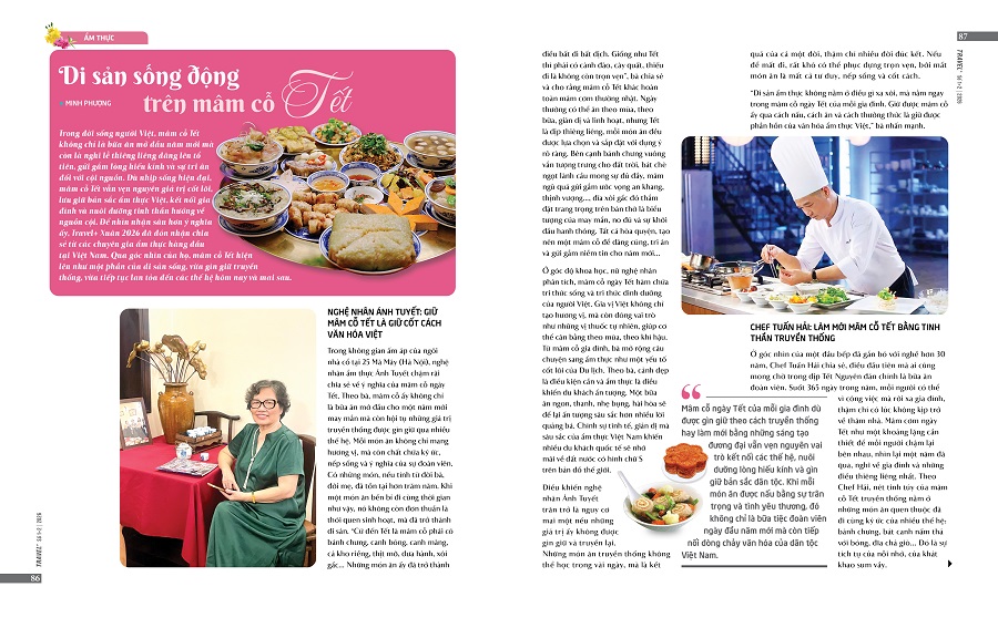 Tại chuyên mục Văn hóa, Travel+ mở ra những lát cắt tinh tế về Tết cổ truyền qua loạt bài viết “Năm Ngọ mạn đàm chuyện ngựa”, “Thú chơi hoa Tết của người Hà Nội” hay “Để tiếng chiêng, nhịp trống không chỉ là ký ức…”. Qua đó, các giá trị truyền thống tiếp tục được gìn giữ, lan tỏa và làm giàu thêm bản sắc Việt. Mạch nguồn văn hóa ấy còn được nối dài trong không gian ẩm thực qua những chia sẻ của Nghệ nhân Ẩm thực Ánh Tuyết, chef Phạm Tuấn Hải, chuyên gia ẩm thực Madam Nhung về mâm cỗ ngày Tết khiến mỗi món ăn không chỉ là hương vị mà còn là ký ức và di sản văn hóa sống động.