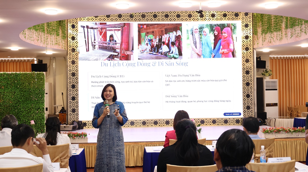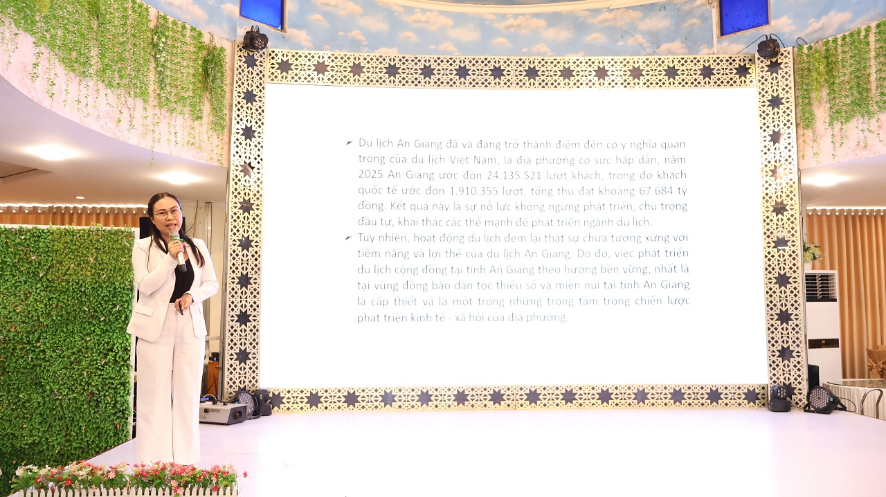 Phát biểu khai mạc Hội thảo, Phó Cục trưởng Cục Du lịch Quốc gia Việt Nam Nguyễn Thị Hoa Mai cho biết, sau hai ngày khảo sát thực tế tại An Giang, đoàn công tác ghi nhận nhiều tiềm năng, song vẫn còn những hạn chế trong phát triển du lịch cộng đồng. Vì vậy, hội thảo ngày hôm nay nhằm thảo luận, tìm ra những giải pháp thiết thực để người dân An Giang, đặc biệt là đồng bào Chăm và Khmer có thể phát triển du lịch cộng đồng một cách bền vững, góp phần nâng cao đời sống cho bà con.