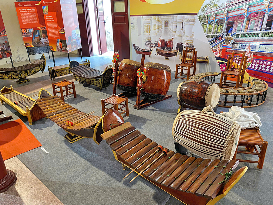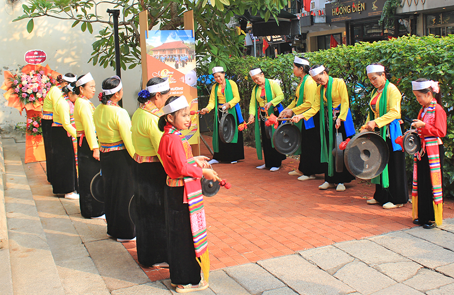 Không gian trưng bày tại phố cổ được thiết kế đầy sinh động, đưa người xem tận mắt chiêm ngưỡng nhạc cụ truyền thống, trang phục, hình ảnh và câu chuyện văn hoá đậm đà bản sắc. Khách tham quan như lạc vào một “bảo tàng sống” khi lắng nghe nghệ nhân trình diễn trực tiếp, chia sẻ ký ức và ý nghĩa của từng nhạc cụ, từng giai điệu, từ chiêng Mường vang trầm đến nhạc Ngũ âm thanh thoát.