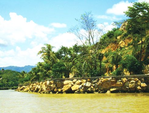Nép mình bên sông là những xóm làng yên ả, thanh bình. Nha Trang nằm gọn trong một thung lũng mà núi quây quần ba mặt tây, nam, bắc nên phong cảnh nơi đây đúng là sơn thủy hữu tình. Tùy theo yêu cầu, tài công sẽ cho tàu ghé lại bên cồn đất nổi giữa sông để bạn thưởng thức nước dừa ngọt mát, hay được chủ vườn hướng dẫn cho bạn tự tay hái xuống những trái mận, xoài, ổi, cam vừa chín tới trên cây, ăn ngay theo kiểu “bao bụng”. Dọc theo bờ nước lợ là những lồng nuôi cá chình trên sông. Chính những chiếc vó, lờ, hom bắt cá, những con đò nhỏ, những nhịp cầu gỗ nối đôi bờ mộc mạc, nguyên sơ… sẽ cho bạn cảm giác bình yên, gần gũi, thân quen, dường như phố biển Nha Trang lộng lẫy, hoa lệ đã lùi đi đâu đó rất xa.