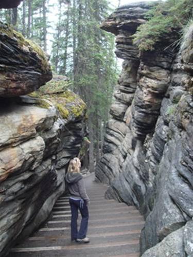 Một điểm rất đặc sắc khác của Athabasca chính là hẻm núi. Hẻm núi ở đây vừa hùng vĩ và ngoạn mục, lại rất kỳ lạ lý thú với những vách đá dựng đứng đầy rêu phong. Các vách đá xếp lớp nằm xiên xiên, kết quả của việc bào mòn của dòng sông băng hàng trăm triệu năm trước, trông lạ lẫm và hoành tráng. Nhiều mảng trông như những chiếc bánh xếp có thể rơi lên đầu bạn bất cứ lúc nào.