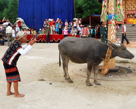 Tiếp đến, người tế trâu khóc: “Trâu ơi, trâu đừng trách dân làng, đây là nghi lễ truyền thống bao đời của dân làng hàng năm hiến tế trâu cho trời, đất, tổ tiên để cầu cho dân làng được bình an, không bị dịch bệnh, thú dữ, hoa màu tươi tốt, mọi người khoẻ mạnh. Cầu cho linh hồn trâu về cõi trời được an lành...”.