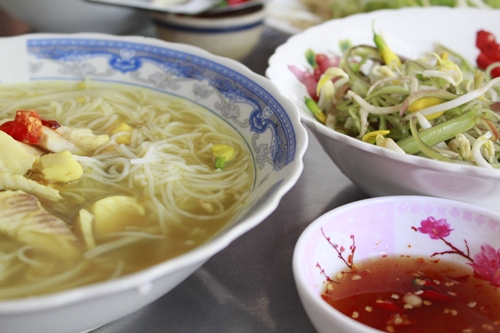 Bún ở Châu Đốc dùng là bún của người Khơ me, sợi nhỏ được xếp ngay ngắn thành từng đoạn dài. Khi bán, người ta sẽ tách ra thành từng phần nhỏ và cho vào tô, sau đó cho cá và nước dùng vào, rắc một ít bột ớt lên trên. Mùi tanh của cá đã hoàn toàn biến mất. Vắt một lát chanh để hương vị càng thêm hấp dẫn, sau khi ăn hết phần bún, bạn có thể chấm bánh mì với phần nước dùng, giống như ăn cà ri bánh mì nhưng lại có cảm giác rất lạ.