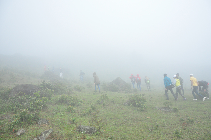 “Chặng đường mù” – nói như người dân bản địa, là quãng đường gian nan nhất để chinh phục đỉnh Cao Xiêm. Chúng ta sẽ phải vượt qua 1/3 chặng đường còn lại với những triền núi có độ dốc lớn, men theo con đường mòn quanh co, uốn lượn qua những tảng đá với mọi hình thù. Ở trên núi, với mây, sương mù dày đặc, ta cảm nhận được cái lành lạnh của mùa đông, sự ướt át của mưa, sự trong lành của núi rừng, cùng với những làn gió từ biển thổi vào khiến mệt mỏi tan biến.