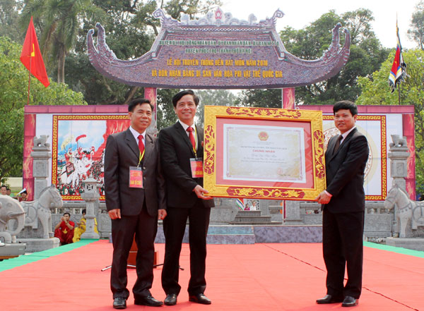 Phó Chủ tịch UBND TP Hà Nội Ngô Văn Quý trao Bằng công nhận Di sản văn hóa phi vật thể quốc gia cho Lễ hội Đền Hát Môn - Ảnh: PC