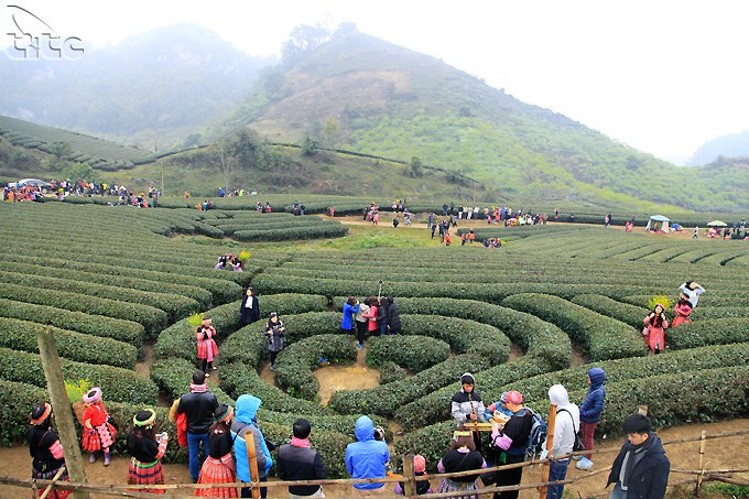 Mặc dù thời tiết cuối mùa lạnh và có mưa rơi nhưng dòng người đổ về đồi chè mỗi lúc một đông. Không chỉ để tận mắt ngắm những đồi chè mà phần lớn du khách, đặc biệt là các bạn trẻ còn thích thú lựa chọn những bộ trang phục truyền thống của người Mông, Dao, Thái để chụp ảnh lưu niệm.