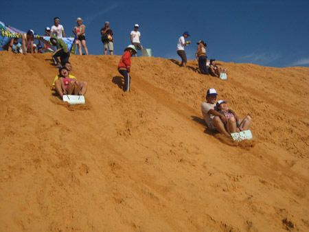 Ngắm cát, chiêm ngưỡng cái bao la kỳ vĩ của thiên nhiên xong, du khách có thể lựa chọn một trong rất nhiều trò chơi cát như trượt cát hoặc tìm cảm giác mạnh với những chiếc xe trượt cát 4 bánh. Những tấm nhựa được cho thuê với giá khá bình dân, 10.000 đồng/tấm cho suốt buổi trượt sẽ khiến cho bạn thực sự được thư dãn với đường trượt từ trên đỉnh đồi.