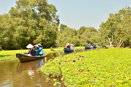 Tháng tư, cái oi bức đến khó chịu của đầu hè như bị xua tan khi vừa bước chân vào cửa rừng. Những cây tràm chục năm tuổi mọc thành luống "nổi" lên mặt nước xanh rờn. Bên dưới là cá trú ngụ, bên trên là chim cò làm tổ, sinh sôi nẩy nở. Khách được đưa vỏ lãi từ cửa rừng xuyên qua vùng đệm. Vỏ máy xé nước lao vun vút. Rẽ vào trảng sen, tiếng động cơ nhỏ lại, vỏ nhè nhẹ lướt qua trước khi vào rừng tràm. Giữa trưa nhưng vẫn có vài con sen, con cò, con vạc mò cá, ốc. Chúng thản nhiên mặc cho dòng người đi qua. Anh lái đò bảo: "Nếu để tiếng máy lớn quá sẽ làm "tụi nó" giựt mình, mơi mốt không ra ăn nữa thì mất đi vẻ tự nhiên". Không ai bảo ai, khi vỏ vào trảng sen, các anh điều chỉnh tiếng máy nhỏ lại và chầm chậm đi qua. Hết trảng sen, vỏ lại lao vun vút trên con kinh đào thẳng tắp để tiến vào sân chim.