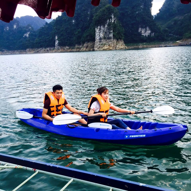 Khách du lịch trải nghiệm dịch vụ chèo thuyền Kayak ở Hồ sinh thái Na Hang