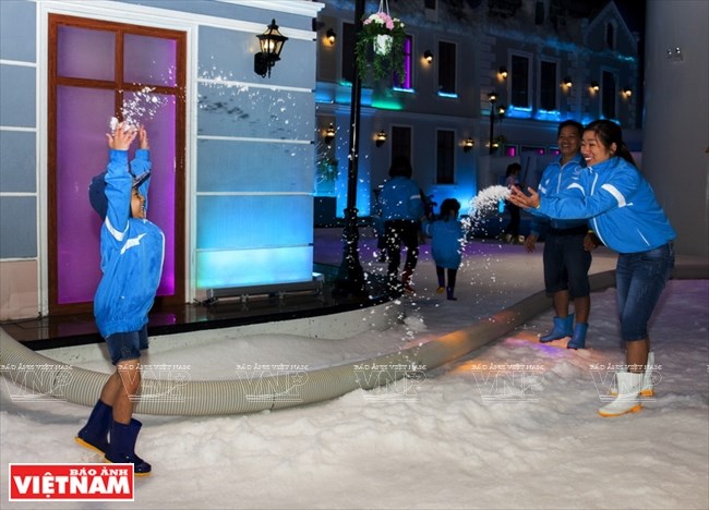 Mang giầy và áo khoác để giữ ấm cơ thể, du khách đứng giữa Snow Town đưa tay hứng những hạt tuyết rơi, có cảm giác như đang ở châu Âu, với mùa Đông lành lạnh trong khung cảnh thật thi vị. Nhiều bạn trẻ vừa đi dạo vừa ngắm tuyết rơi, vừa cùng nhau nặn người tuyết và tạo dáng chụp hình để lưu giữ lại những kỷ niệm đẹp khi đến với “thị trấn tuyết.”