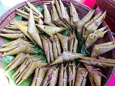 Theo lời giới thiệu của chị Alăng Thị Nhâm, huyện Đông Giang, tỉnh Quảng Nam, người đã cùng đoàn mang những thúng gạo nếp nương, nếp cẩm, lá đót… từ vùng biên giới Quảng Nam về đây, bánh sừng trâu là món đặc sản mà người lớn hay trẻ nhỏ ở quê hương chị đều biết.