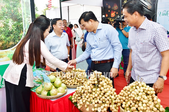 Đại biểu tham quan gian trưng bày trái ngon đến từ huyện Phong Điền, thành phố Cần Thơ.