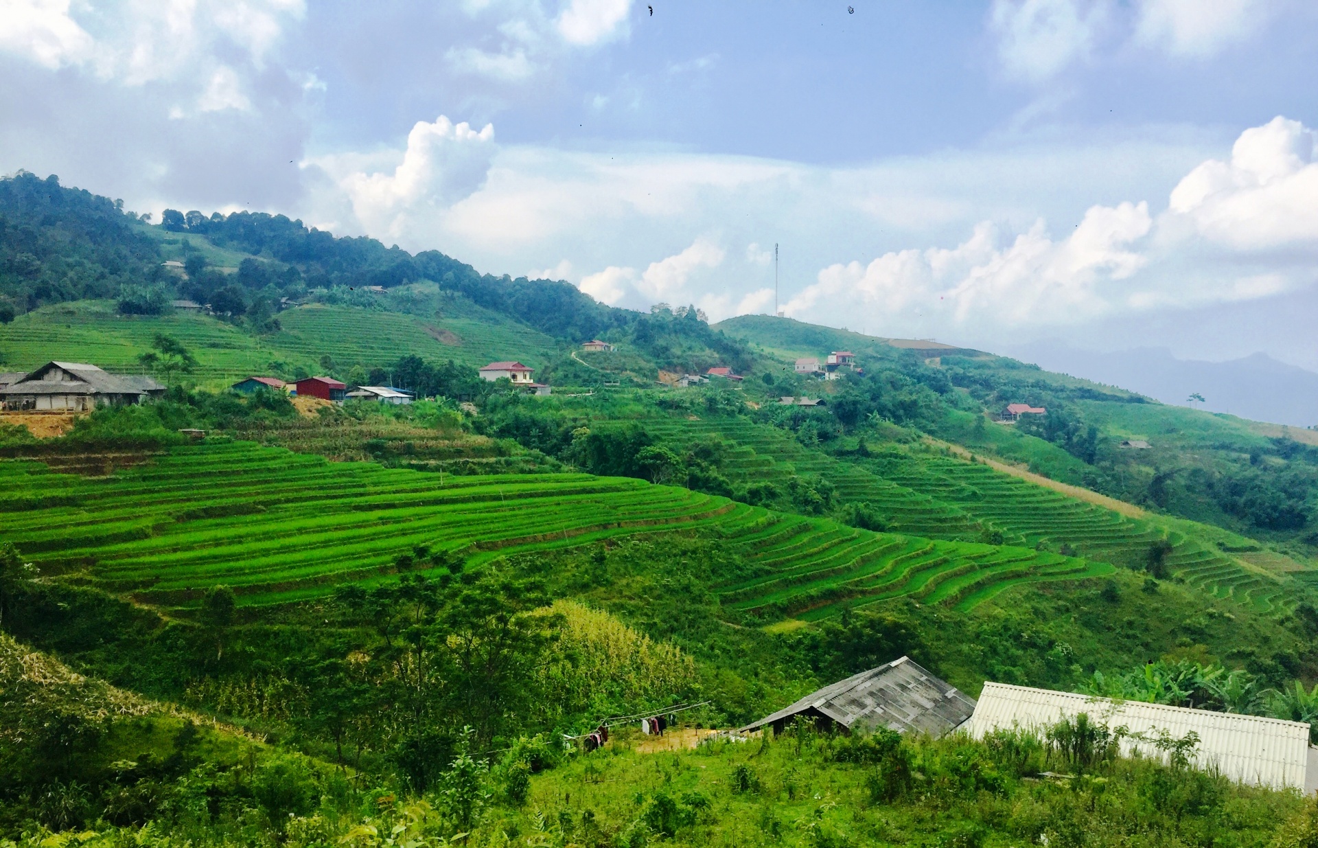 Những thửa ruộng bậc thang uốn lượn theo sườn núi.