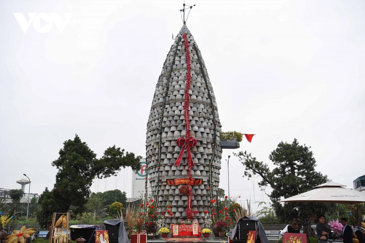 Toàn cảnh Tháp Thần Nông cao 15m, gồm 5 tầng, được ghép từ 1.012 chiếc cối đá