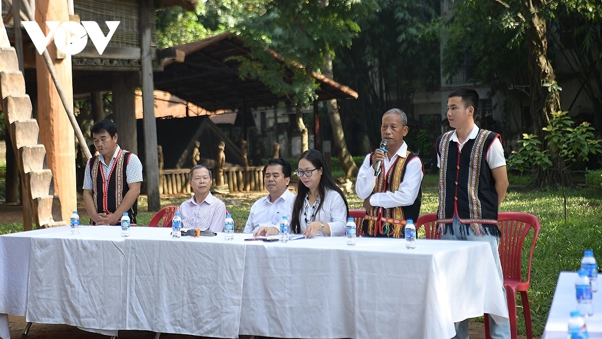 Già làng A Ngêh (thứ 2 bên phải) và nghệ nhân A Wăng (ngoài cùng bên trái) chia sẻ tại tọa đàm.