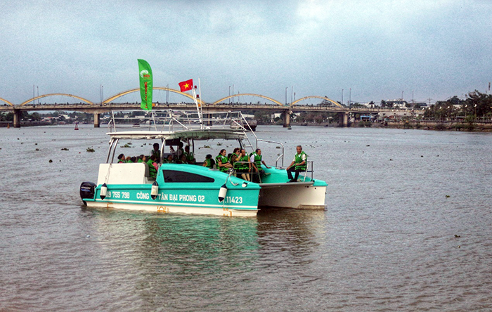 Các đại biểu dự lễ trải nghiệm tham quan sông nước Cần Thơ trên tàu hai thân hiện đại. Ảnh: Kiều Mai