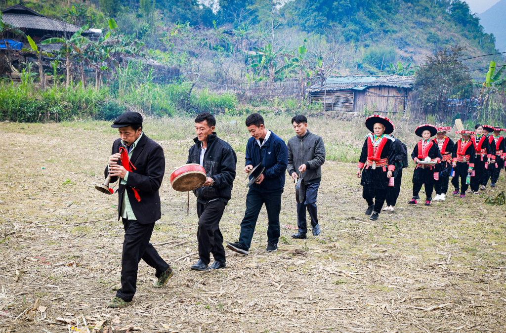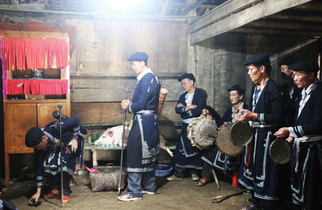 Đội nhạc trong nghi lễ đón Sài Mạ trong cấp sắc 12 đèn của người Dao Đỏ ở xóm Tàn Pà, xã Ca Thành.