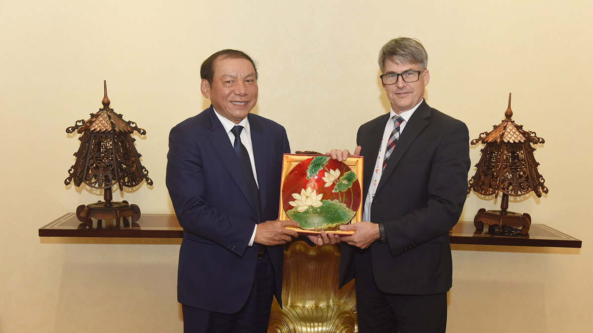 Bộ trưởng Nguyễn Văn Hùng tặng quà lưu niệm Nguyên Đại sứ Brian McFeeters. Ảnh: TITC