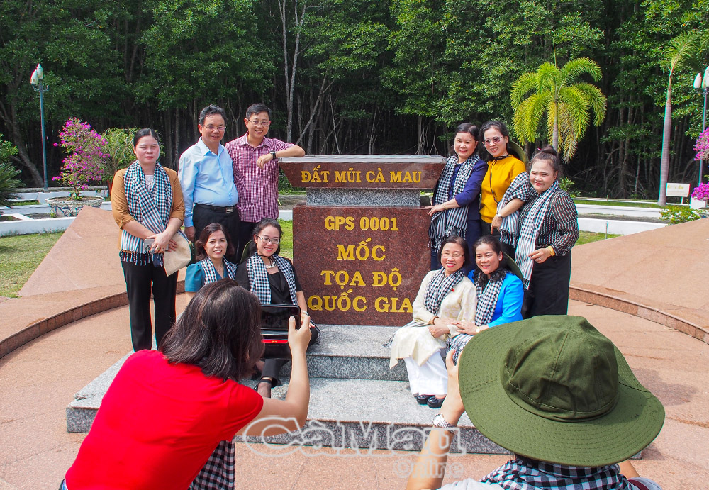Khách du lịch chụp ảnh lưu niệm tại mốc toạ độ Quốc gia GPS 0001 trong Khu Du lịch Mũi Cà Mau.