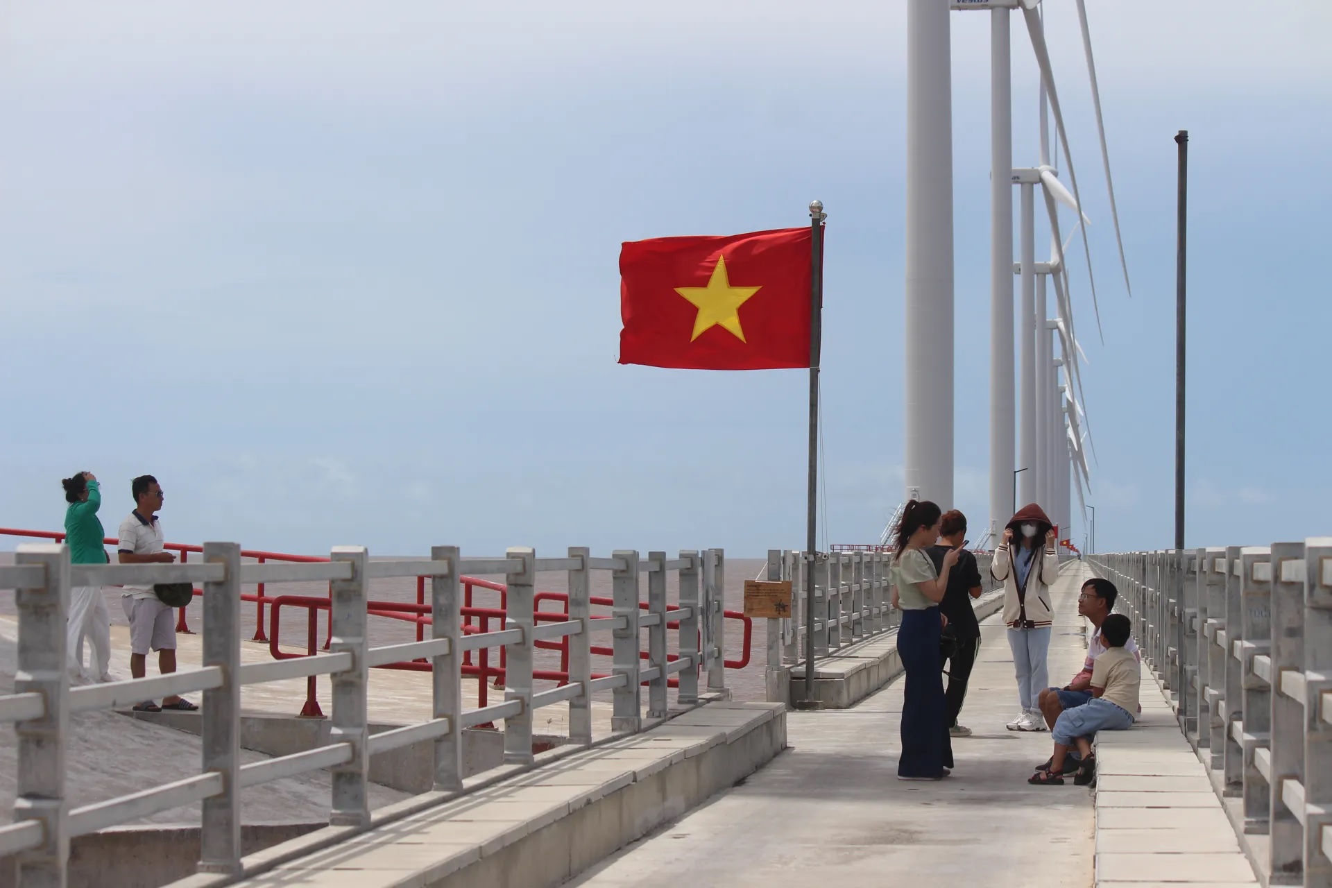 Xe điện đưa du khách ra điện gió ngoài khơi Cà Mau, cách đất liền hàng chục km. Ảnh Hoàng Nam