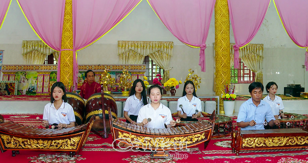 Đội múa trống chhay-dăm chùa Đìa Chuối thu hút nhiều bạn trẻ tham gia phát triển năng khiếu.