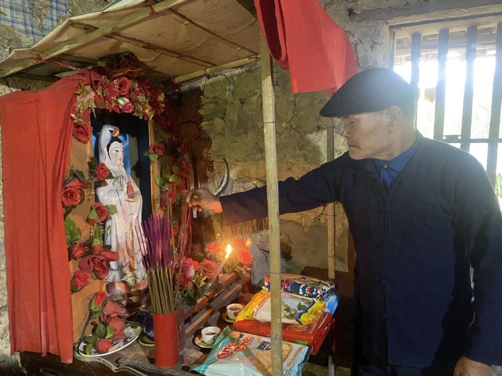 Ông Nông Văn Tích, xóm Bản Chu, xã Phục Hòa thắp hương lên ban thờ bà tiên được rước về nhà sau lễ hội xuân năm 2025 đến nay.
