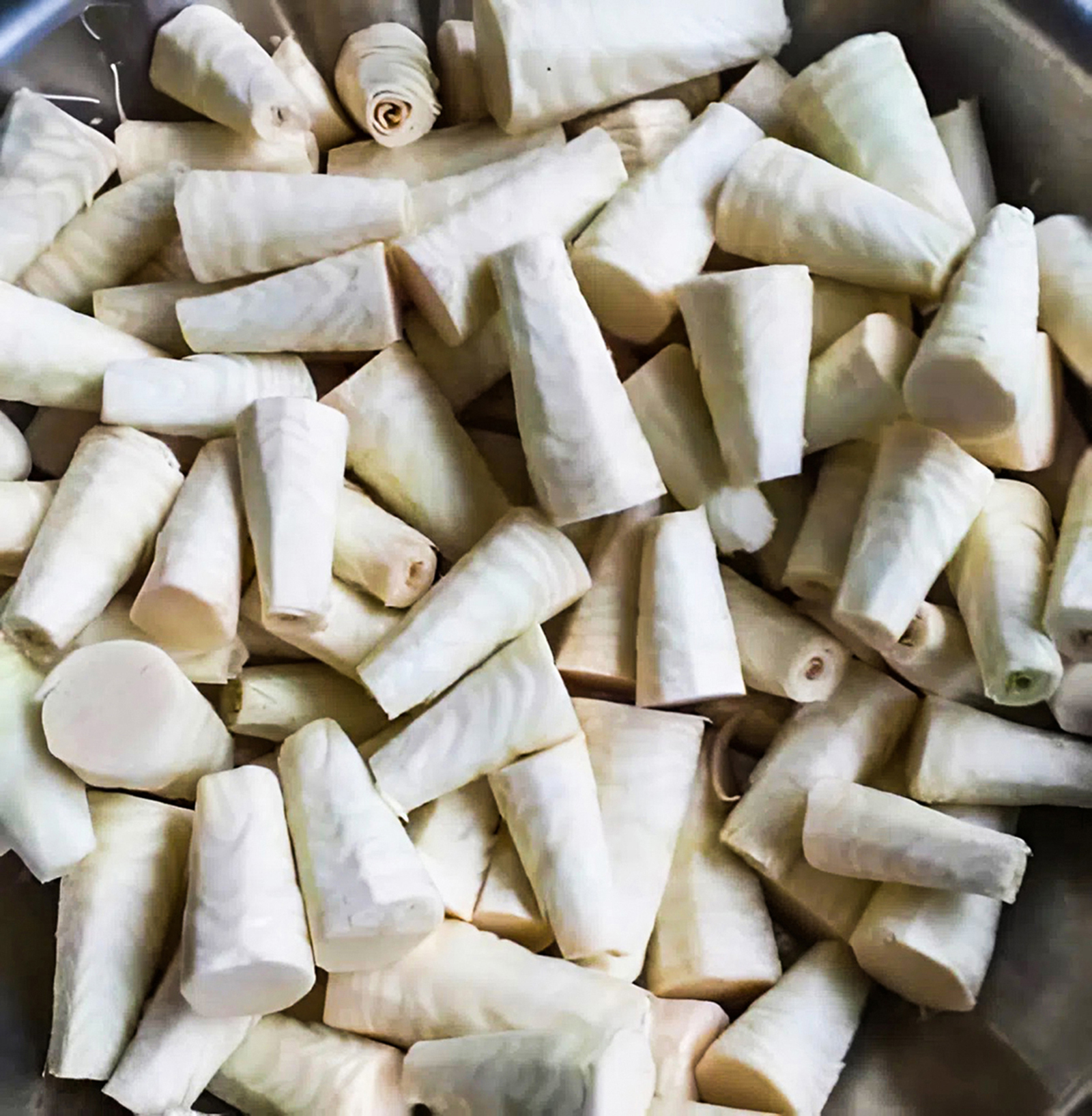 “Cây khóm lâu năm bị lão, không cho năng suất cao, người dân phải phá bỏ để trồng mới. Từ những bụi khóm bỏ đi, bụi khóm còn nhỏ hoặc chồi non mọc gần gốc khóm không còn khả năng nhân giống, bà con tách lấy phần củ hủ bên trong. Chúng tôi chế biến được đủ món như xào, nấu canh hoặc làm bánh xèo...”, chị Mè chia sẻ.