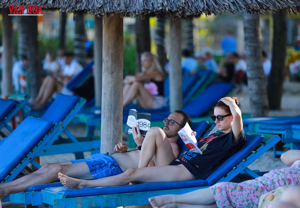 Du khách quốc tế nằm sưởi nắng và đọc sách trên bãi biển