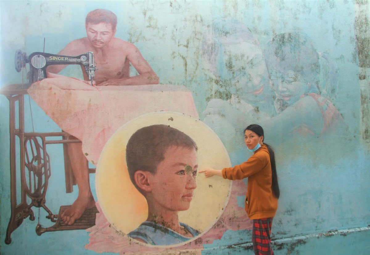 Chị Lương Thị Tường Vy, ở khối phố Hòa Trung cho biết, bức tranh vẽ cảnh sinh hoạt gia đình chị đã xuống cấp. Hình ảnh chân dung chị bồng con cũng bị phai màu, nhiều chỗ bong tróc, làm mất đi vẻ đẹp ban đầu.