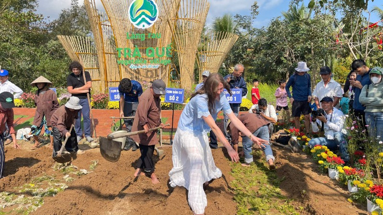 Du khách quốc tế tham gia trồng rau tại Lễ hội cầu bông Trà Quế, thành phố Đà Nẵng.